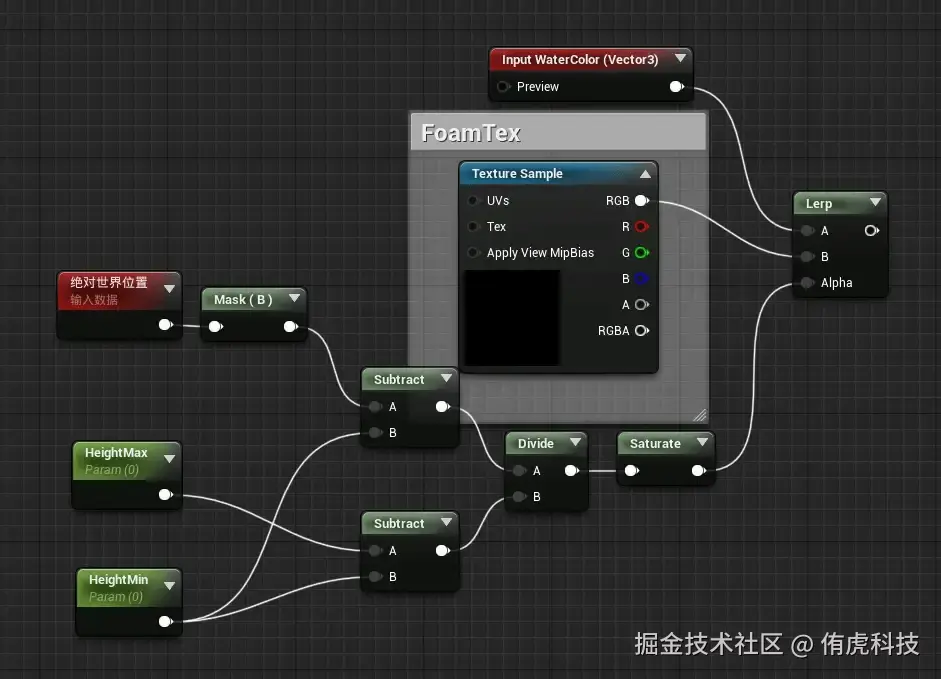 目前制作水体边缘泡沫的绝大多数方案的基本思路都是遮罩+噪声+FoamTexture,区别只在于具体制作细节的不同尝试。由于边缘泡沫多分布于岸边较浅区域,所以我们可以直接使用前面计算水深颜色时获得的水深图,制作一个边缘泡沫遮罩。