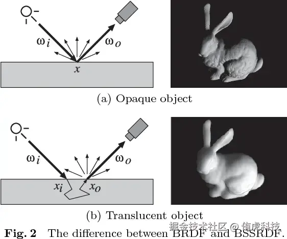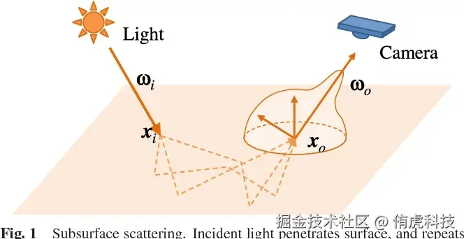 上图是BSSRDF(Bidirectional Subsurface Scattering Reflection Distribution Function,双向子面散射反射分布函数)示意图,它用于计算光线与复杂材质相互作用时的散射和反射行为,以实现逼真的次表面散射渲染和光照效果。