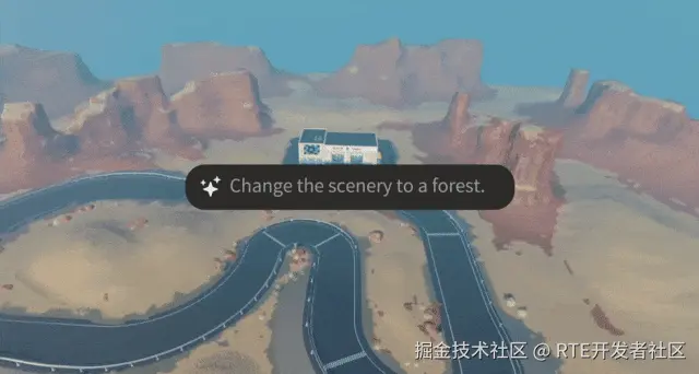 - 从文本到 3D 的实时转换:通过简单的文本提示(例如描述一个沙漠),AI 可以自动生成 3D 场景。开发者随后又用一个简单的指令将沙漠转换为森林场景。这种基于提示符的生成能力,使得创建复杂的 3D 环境变得更加便捷。