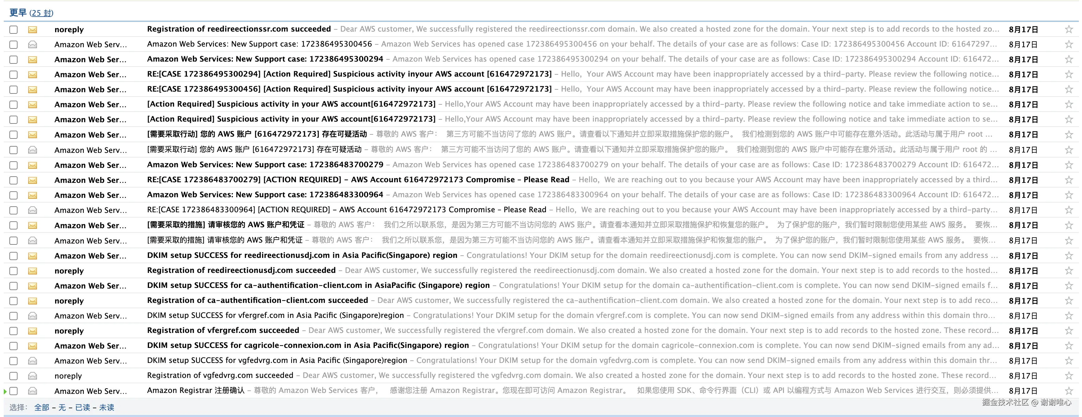 2024-08-18 22:50发现qq邮箱好多aws的邮件通知(意识到aws被攻击了,慌了~)