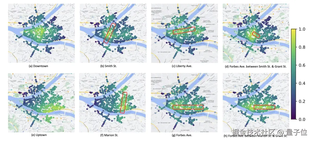 通过给定不同精细程度的地址文本的查询(如街区,街道,子街道),模型都可以在测试集图像上展示出与其真实覆盖地理分布一致的激活。