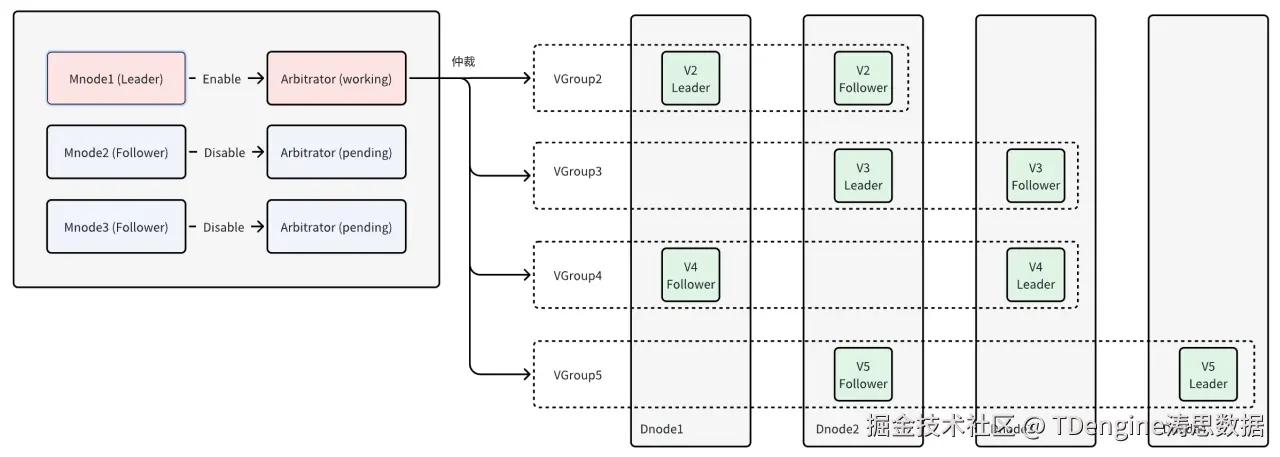 仲裁者 (Arbitrator) 在双副本方案中发挥关键作用。它提供仲裁服务但不存储数据。当 Vgroup 因某一 Vnode 故障而无法提供服务时,Arbitrator 可以根据同步情况指定同组另一 Vnode 成为 Assigned Leader,无论其他副本 Vnode 是否存活,均可一直响应用户请求。这一机制确保了即使在某个副本节点故障的情况下,Assigned Leader 仍然能够一直响应用户请求,从而提高系统的可靠性和可用性。
