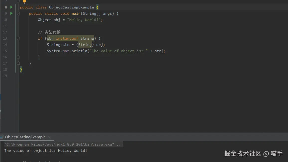 instanceof关键字用于检查对象是否属于某种特定类型。如果检查通过,我们可以将Object强制转换为该类型。- 这种方式是最基本的,但需要确保类型匹配,否则会抛出