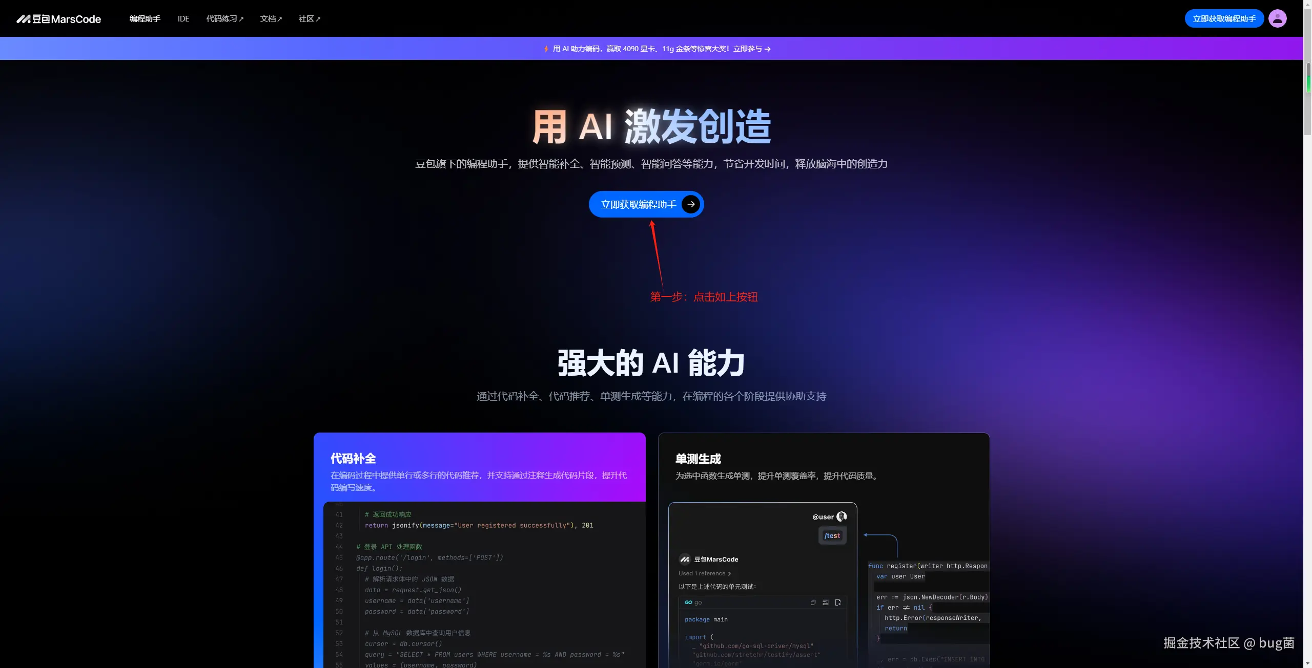 首先,我们需要先到MarsCode官网注册一个账号,官网注册地址直达车。注册完之后,我们进入到官网页面,这个时候,呈现在大家眼前的就是我想为大家介绍的AI编程助手--豆包MarsCode,使用起来绝绝子。