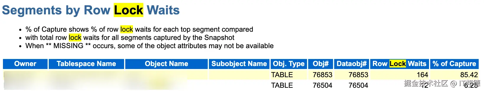 同时在AWR报告能详细的看到这些信息,列出的锁表时出现的等待事件以及GC等待事件跟故障现象匹配。
