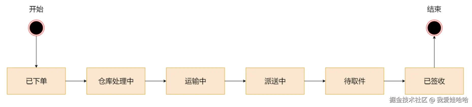 为了帮助你更好地理解状态模式的适用场景,下面我们还是通过一个简单的例子来演示一下。在线上购物的过程中,当我们选定好了商品并提交订单后,装有商品的包裹就会开始进行运送。这里我们定义 6 种简单的包裹运送状态:已下单、仓库处理中、运输中、派送中、待取件和已签收。如下图所示: