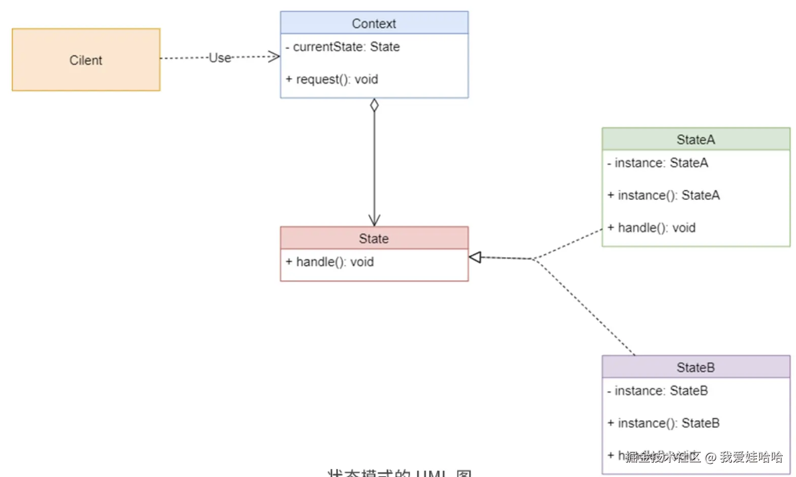 从这个 UML 图中,我们能看出状态模式包含的关键角色有三个。