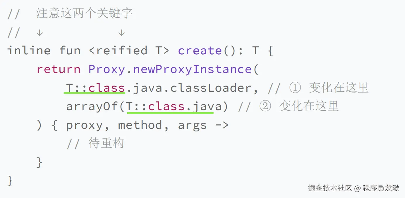 create() 会接收一个Class类型的参数。其实,针对这样的情况,我们 完全可以省略掉这个参数。具体做法,是使用我们前面学过的inline,来实现类型实化 ****(Reified Type)。我们常说,Java 的泛型是伪泛型,而这里我们要实现的就是真泛型
