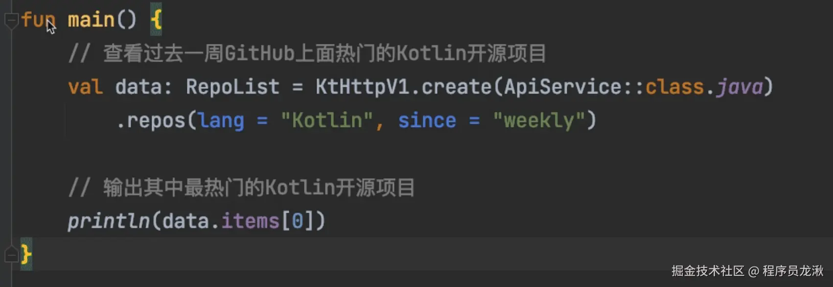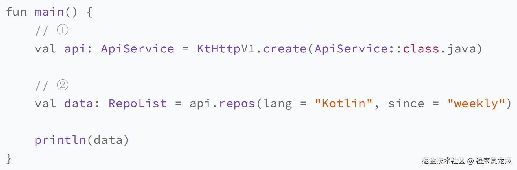- 注释②:我们调用 api.repos() 这个方法,传入了 Kotlin、weekly 这两个参数,代表我们想