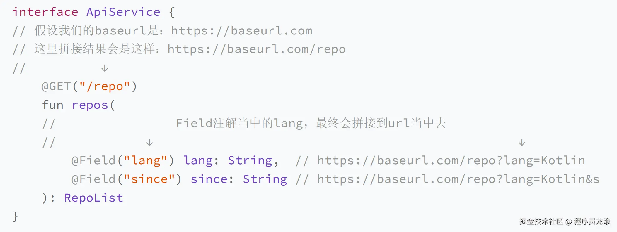 - Field 注解,代表了 GET 请求的参数。Field 注解当中的值也会和 URL 拼接在一起