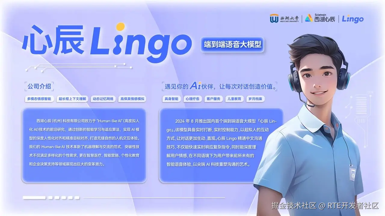 西湖心辰是一家专注于人工智能多模态大模型技术研究与产业化应用的创新企业。我们自主研发的「西湖大模型」,具备卓越的语义理解、逻辑推理、知识整合与多轮对话能力;Lingo 语音端到端大模型,以其实时打断、实时控制和超拟人化交互领先业界。公司源自西湖大学深度学习实验室,汇聚顶尖人才与算力,致力于构建深度定制的多模态智能体平台,服务于教育、医疗、消费、政企等多个领域,引领行业智能化转型,赋能经济高质量发展。