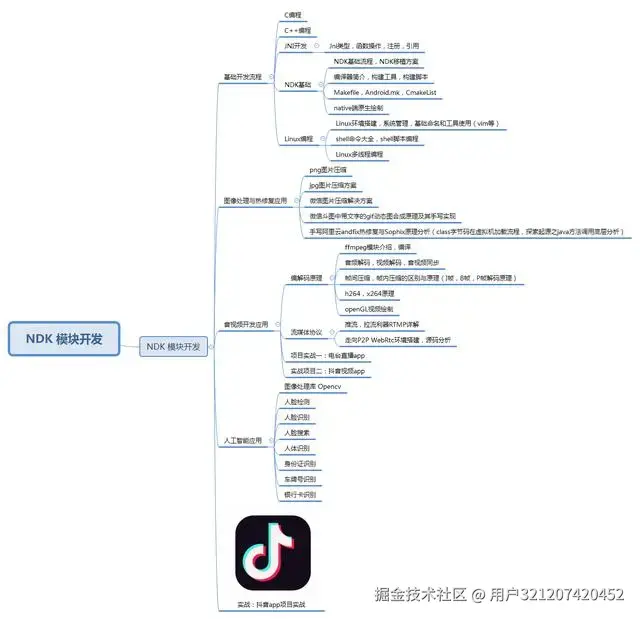 - 要学习好NDK,其中的关于C/C++,jni,Linux基础都是需要学习的,除此之外,音视频的编解码技术,流媒体协议,ffmpeg这些都是音视频开发必备技能,而且