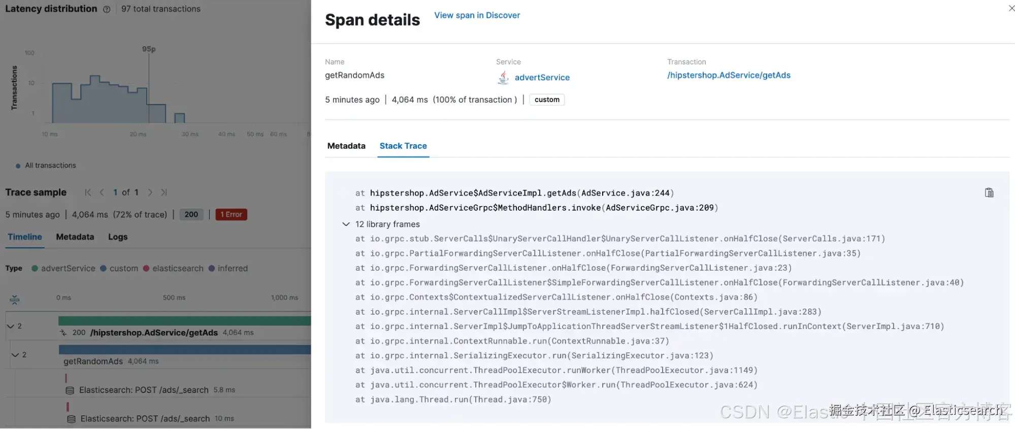 在许多情况下,分布式跟踪中的跨度相对粗粒度,特别是在未使用推断跨度等功能时。准确了解跨度在代码路径中的起源位置可能非常有价值。为了满足这一需求,OTel Java 代理的 Elastic 分发包括跨度堆栈跟踪功能。此功能通过收集超过可配置最小持续时间的跨度的相应堆栈跟踪来提供关键见解,从而准确指出跨度在代码中的起始位置。
