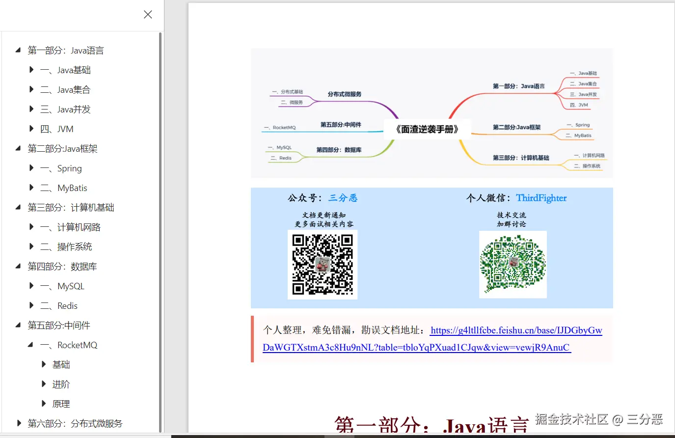这一部分推荐我本人写的《面渣逆袭手册》,基本上涵盖了80%的面试考点,关注公众号三分恶,后台回复666无套路获取。