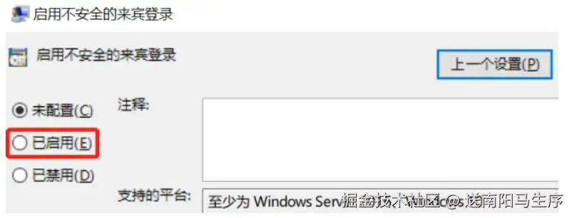 - (3)双击 “启用不安全的来宾登录”,选择 “已启用”: