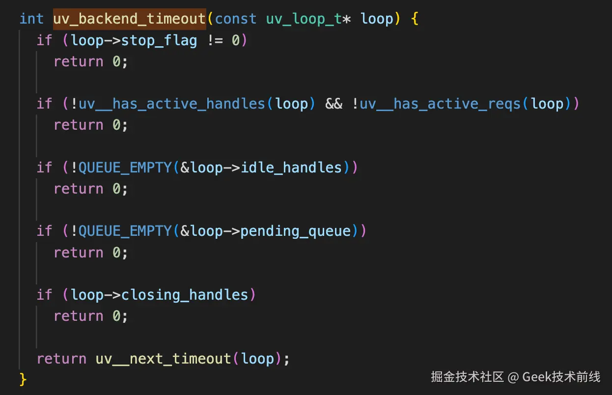 // 获取尚未触发的离现在最近的定时器的时间间隔(uv_backend_timeout),即事件循环到下一次循环的最长时间