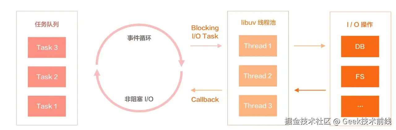 事件循环会尝试从 libuv 的线程池中取出一个空闲线程去执行队列中的操作,执行完毕获得结果后,通知主线程,主线程执行相关回调,并且将线程实例归还给线程池。通过此模式循环往复,来保证非阻塞 I/O,以及主线程的高效执行