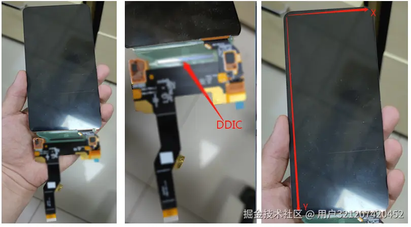 目前手机屏幕和SOC间多使用MIPI接口来传输屏幕数据,其实物如下图所示,图中的条状芯片就是负责更新显示屏的显示内容的芯片DDIC, 它一边通过mipi协议和SOC通信,一边把获取到的显示数据写入到显示存储器GRAM内, 屏幕(Panel)通过不停扫描GRAM来不停更新液晶显示点的颜色,实现画面的更新。