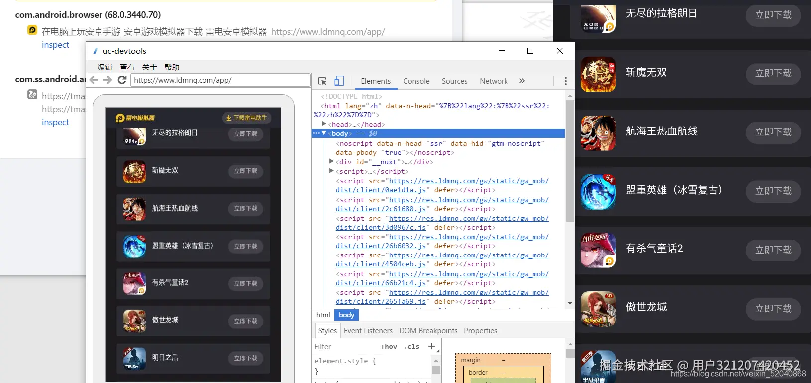 这三者,uc链接已经给到大家了,xposed可以网上下载,至于webviewdebughook模块需要的网上肯定也有,也可以直接私聊我拿。三者此工具缺一不可。有了这工具就可以快乐的元素定位了。