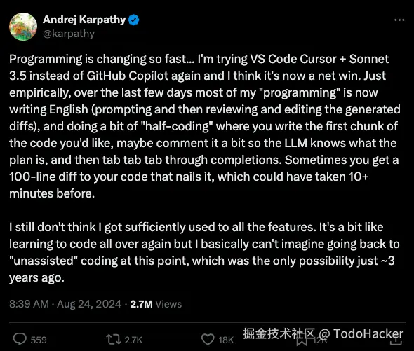 Andrej Karpathy 在一篇 Twitter 帖子中分享了他对 Cursor 的使用感受。他提到,使用 VS Code、Cursor 和 Sonnet 3.5 相比 GitHub Copilot,编程体验变得更加高效。他发现自己在编程过程中更多地使用自然语言进行提示,然后审查和编辑生成的代码差异(diffs)。他称这种方式为"半编程",即先写一部分代码或通过注释提示推断他的计划,然后通过按 Tab 键完成代码的生成。