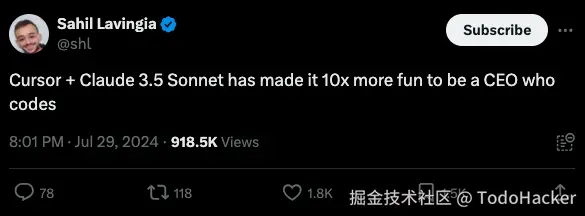 Gumroad 创始人 Sahil Lavingia 觉得 Cursor 有趣 10 倍以上