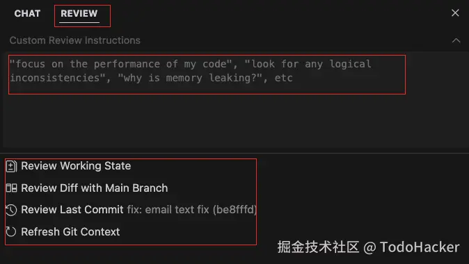 - 输入你的审查要求,如:"关注性能"、"关注代码隐患"、"关注代码可读性"。