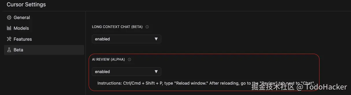 注:目前,Cursor 的最新版本是 0.40.4 ,AI Review 功能还处于 Beta 阶段(接下来的 long context chat 也是处于 beta 阶段),如需开启,可以按照 settings -> cursor setting -> beta 找到开关,并将其开启,具体如图所示: