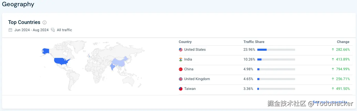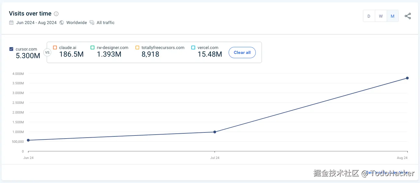 与此同时,Cursor 的官网流量在过去几个月内呈现爆发式增长。(以下数据来源于 similarweb.com,仅供参考)