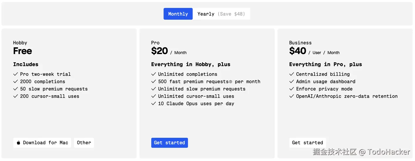 默认情况下,Cursor 在试用期之后,或超出使用上限时,会提醒你通过订阅套餐来继续使用。(以下是 Cursor 按月付费的订阅说明)