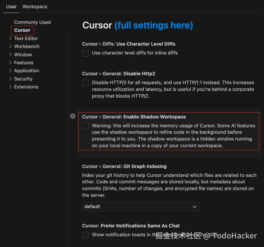除了以上的功能,Cursor 还隐藏了一个功能,叫做影子工作区,该功能默认是关闭的,因为会占用大量内存。开启步骤为:Cursor->Settings...->Vs Code Settings->Cursor->Cursor > General: Enable Shadow Workspace(注意:这里的入口不再是 Cursor Settings 了)