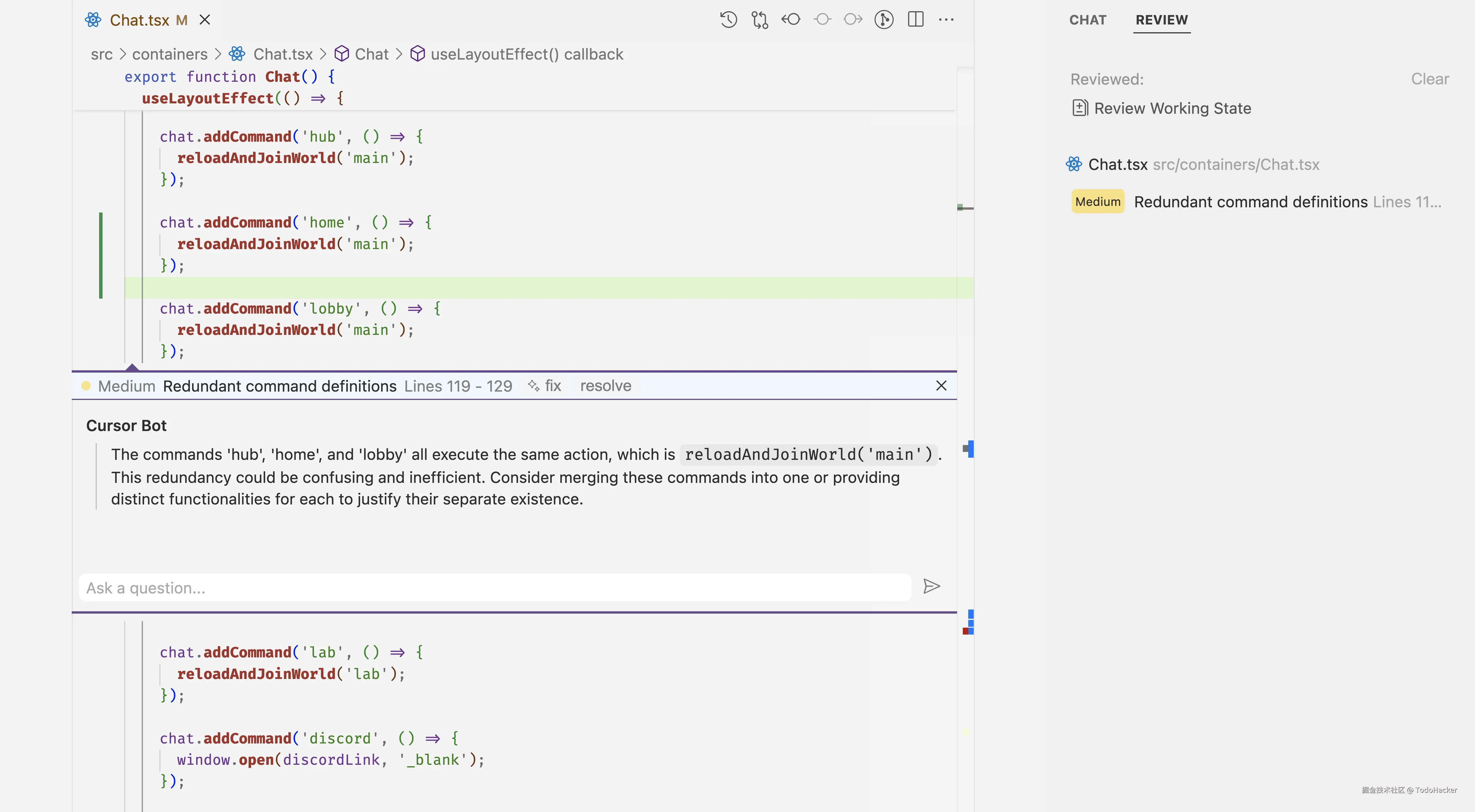 上面的审查结果显示,当前项目中有 3 个代码块新增了 3 个命令,但这三个命令的执行内容却完全相同,这不仅造成了冗余,还增加了维护成本。试问,用户该用哪个命令呢?