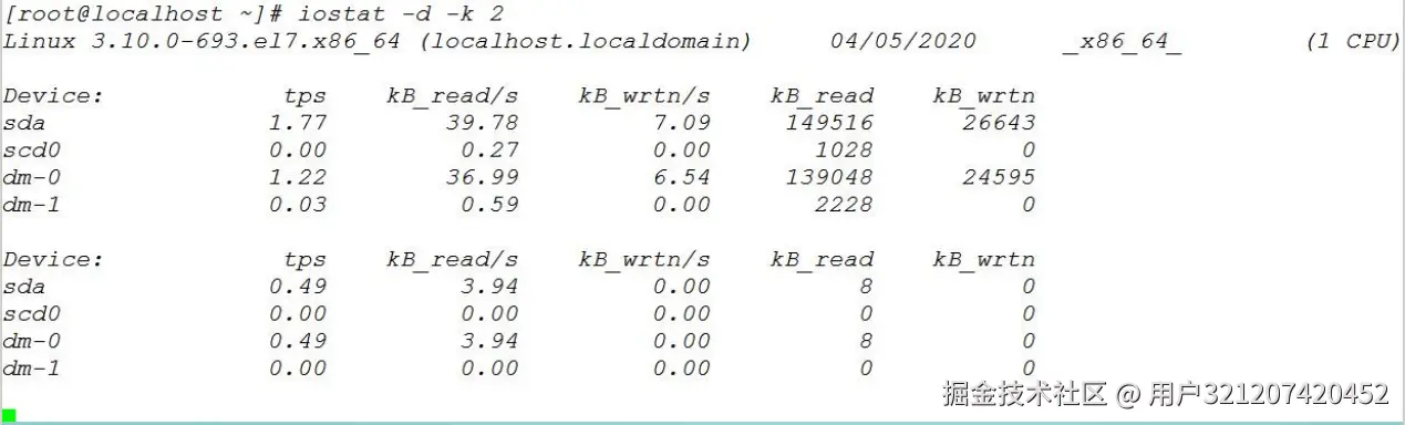 参数 -d 表示,显示设备(磁盘)使用状态;-k 某些使用 block为单位的列强制使用Kilobytes为单位;2表示,数据显示每隔2秒刷新一次。