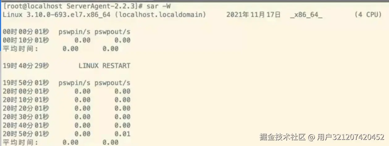 方法2: sar –W 10 3 (10和3代表了每个10秒监控一次,总共监控3次)