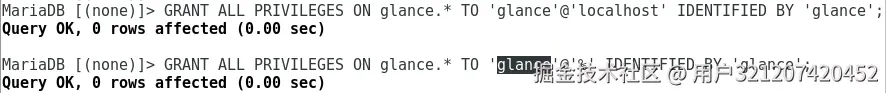MariaDB [(none)]> grant all privileges on keystone.* to 'keystone'@'localhost' identified by 'keystone';