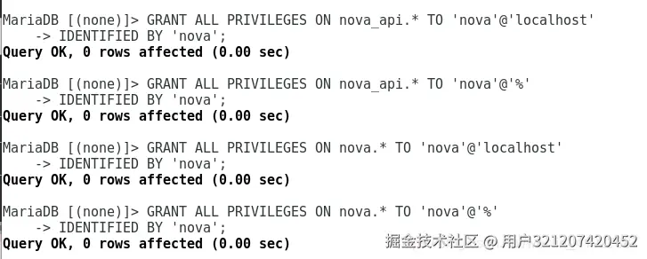 MariaDB [(none)]> GRANT ALL PRIVILEGES ON nova_api.* TO 'nova'@'localhost'