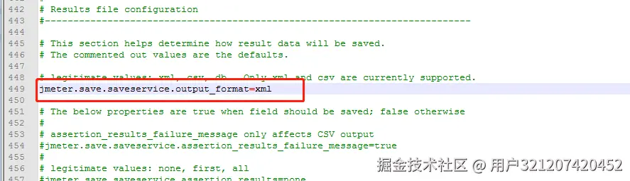 2.5、配置jmeter.properties文件,位置在jmeter/bin目录,将配置项jmeter.save.saveservice.output_format前面的注释去掉,值改为 xml,见下图