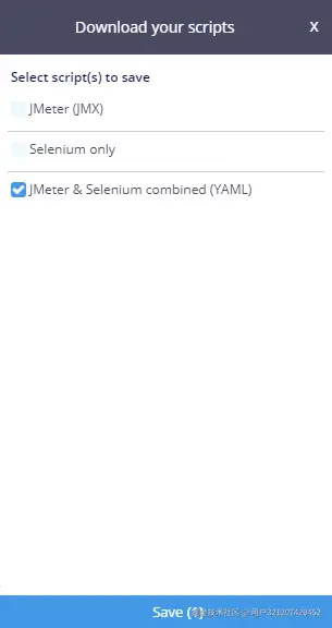 点击,选择保存类型JMeter(JMX)、Selenium only、JMeter & Selenium combined(YAML)。