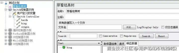运行脚本,察看结果树,会发现此时会运行baidu; 依次变更index的值为1和2,会相应的运行bing和sougou。通过本示例可以看到Switch控制器会读取index变量,并根据Switch控制器下的请求顺序执行相应的操作。