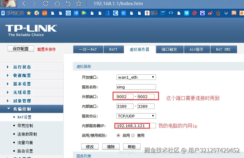 第一步,访问公司路由器设置页面192.168.1.1 传输控制--虚拟服务器--新增如下图一条信息