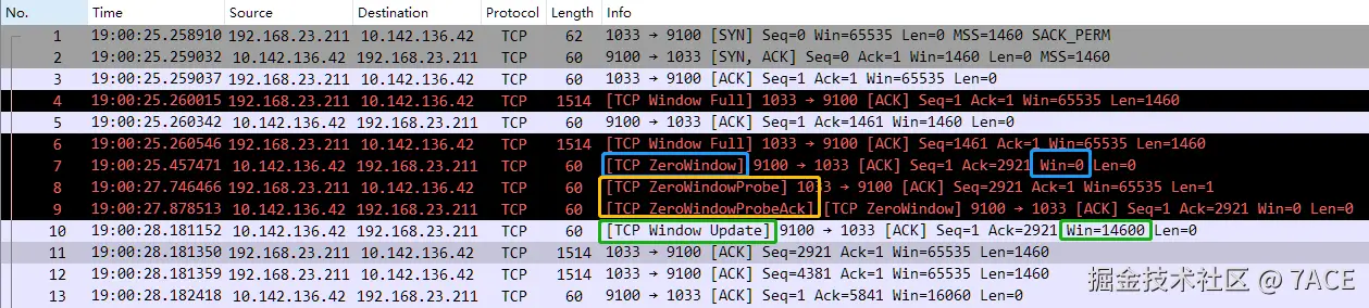🤣 大满贯场景,覆盖了 5 种 TCP 分析标志。首先客户端发送数据,发现服务器接收窗口满了,则在 No.4 和 No.6 上标识 [TCP Window Full] ,此时服务器端 No.7 因为 Win 为 0 且未设置 SYN、FIN、RST 的情况下,标识为 [TCP ZeroWindow],之后陷入等待,大概 2 秒+后,客户端发送了 No.8 [TCP ZeroWindowProbe] 用于确认服务器端接收窗口是否恢复,服务器紧接着回复确认 No.9,表示仍处于零窗口未恢复,标识为 [TCP ZeroWindowProbeAck] + [TCP ZeroWindow] ,又再过了 300ms 后,服务器端发送 No.10 Win 此时更新为 14600,表示接收窗口已恢复,标识成 [TCP Window Update] ,至此完成一次完整的零窗口出现、探测及恢复过程。