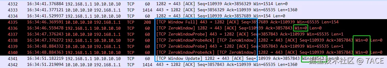 首先服务器端发送数据,发现客户端接收窗口满了,则在 No.278 上标识 [TCP Window Full] ,此时客户端 No.281 因为 Win 为 0 且未设置 SYN、FIN、RST 的情况下,标识为 [TCP ZeroWindow],之后 12ms 紧接着就发送了 [TCP Window Update] 窗口更新消息,Win 恢复成 4536,该交互过程并没有出现 [TCP ZeroWindowProbe] 等数据包。
