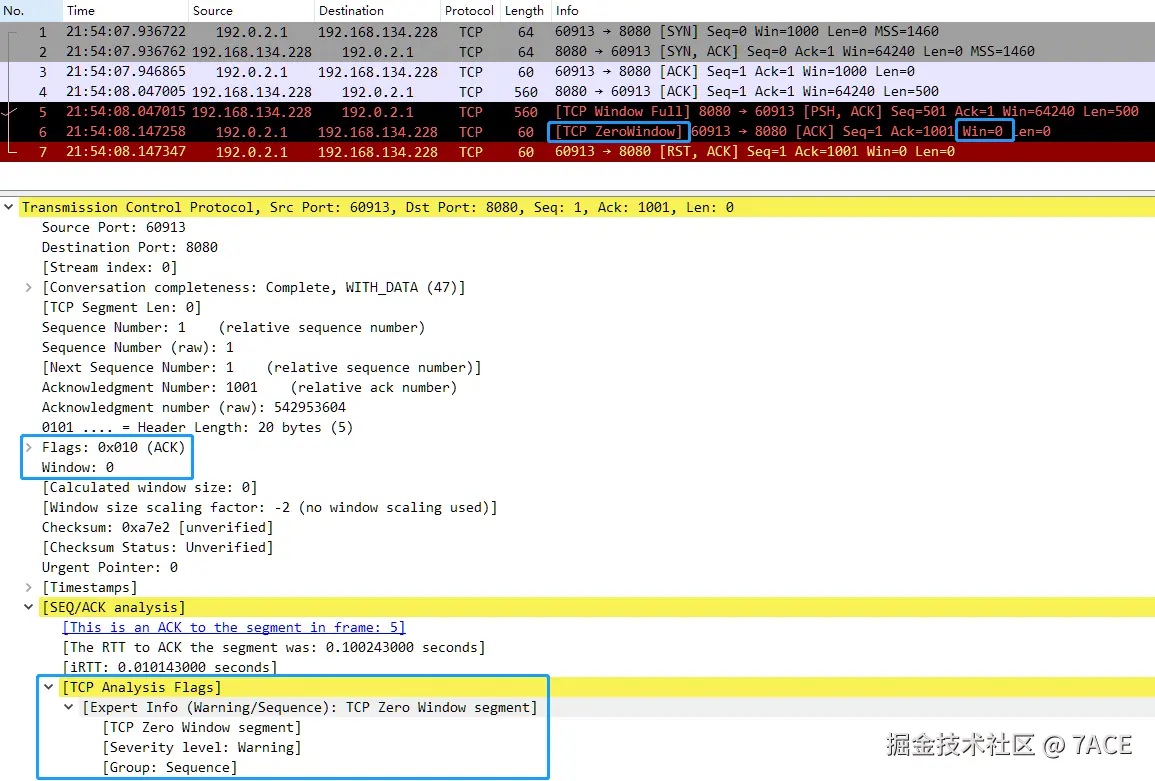 经 Wireshark 展示如下,No.6 因为 Win 为 0 且未设置 SYN、FIN、RST 的情况下,标识为 [TCP ZeroWindow] 。