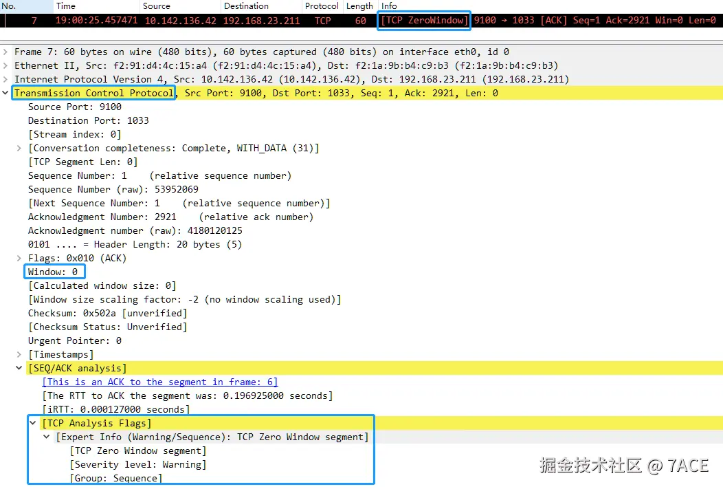 在数据包文件中进行 TCP 分析时,关于 "TCP ZeroWindow" 一般是如下显示的,包括: