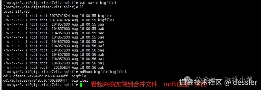[root@iz2vci40gfjzarlead7vliz split]# md5sum bigfile bigfile1