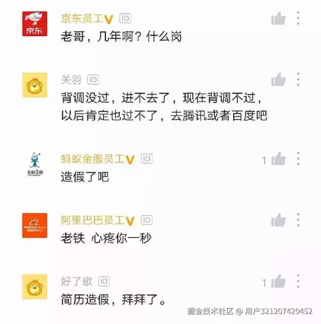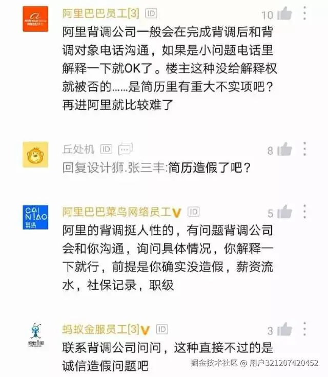 如下则是另外一些网友的评论:背调没过,进不去了,现在背调不过,以后肯定也过不了;背调没过,你再也不会有机会了,已经进黑名单了;阿里背调不管有没有人说坏话,背调就俩,学历有没有造假,工作经历职级有没有造假。只要这俩没问题,就不会卡被调;不沟通背调没过,大概率有很大的问题,以后基本无缘阿里了。