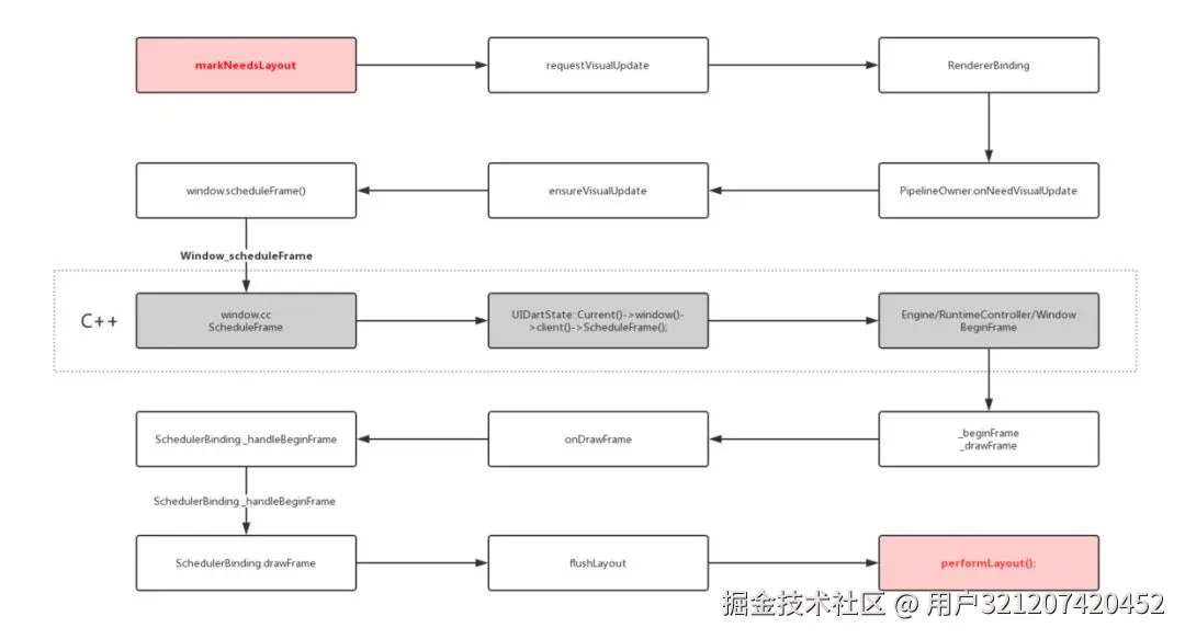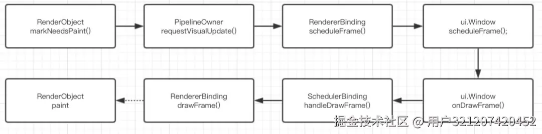 Flutter 中 RenderObject 在 attch/layout 之后会通过 markNeedsPaint(); 使得页面重绘,流程大概如下: