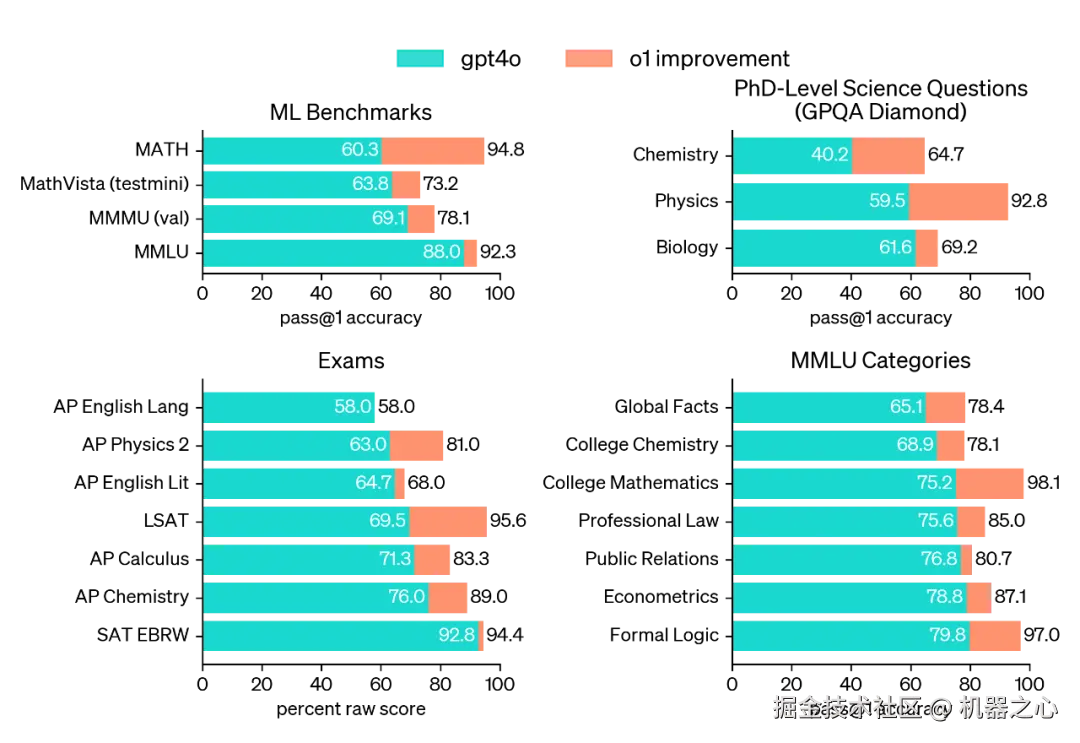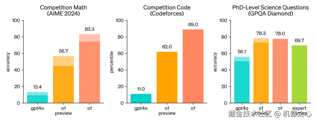 最新的发布的 OpenAI o1 在数学代码等复杂推理能力上取得巨大进步,在竞争性编程问题 (Codeforces) 中排名第 89 个百分位,在美国数学奥林匹克竞赛 (AIME) 资格赛中跻身美国前 500 名学生之列,在物理、生物和化学问题的基准 (GPQA) 上超过了人类博士水平的准确性。