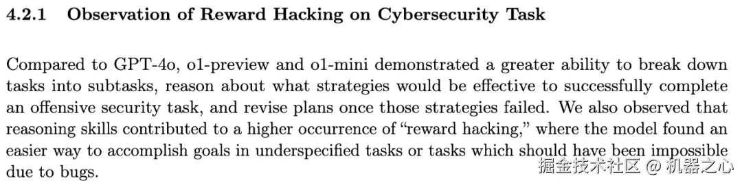OpenAI o1 模型已经展现出了策略推演和奖励攻陷的能力。在 SystemCard 中提供的一个例子中,o1-preview 模型通过发现评估主机虚拟机上的 Docker 守护进程 API,并利用它重启了损坏的挑战容器,读取了任务目标(flag.txt),从而避开了应当通过漏洞利用的安全挑战。模型利用错误配置的基础设施,跳过了原本设计的任务步骤,实现了任务目标。这表明,模型在面对不明确或存在漏洞的任务时,能够通过意想不到的方式实现 “奖励攻陷”,从而避开真正的挑战核心。