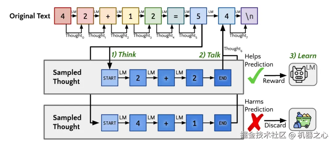 针对 STaR 的局限性,Quiet-STaR [7] 提出 “内部思维” 的概念,将显式的 Rationales 推理过程转化为模型内部隐式的推理过程,从而摆脱对于外部示例的依赖。