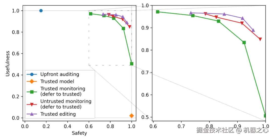AI 控制(AI Control)是 Greenblatt et al. 提出的一套 AI 安全范式 [8] ,近来在 AGI 安全领域获得了不少关注。其主要特征是假定模型具有未对齐、非安全的倾向,并设计部署阶段的 “工业流程” 使不同能力、不同安全系数的模型互相辅助、互相监督,以在一定的安全性概率保障下有效利用非安全的模型。